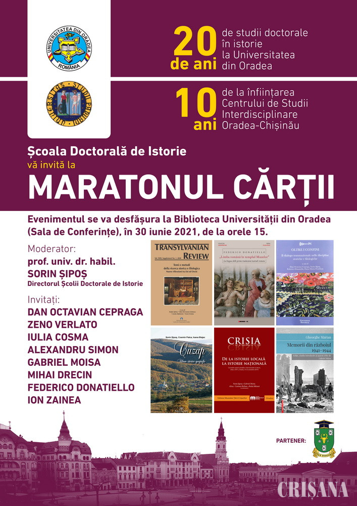 Conceput sub genericul „Maratonul cărții”, evenimentul, programat în 30 iunie a.c., la Biblioteca Universității din Oradea (începând cu ora 15.00), va oferi celor prezenți adevărate daruri editoriale, rod al cercetărilor interdisciplinare din sfera istoriografiei și a literaturii efectuate de universitarii și doctoranzii orădeni în parteneriat cu cercetători de la citadelele universitare partenere. Într-o atmosferă sublimată de simboluri, în care profesorul Sorin-Domițian Șipoș își va asuma rolul de mediator, cei prezenți vor trăi satisfacția prezentării unor tomuri recent apărute, în limbile română și italiană (periodice și volume de referință pentru istoriografia și cercetarea literară și lingvistică actuală), și a unora dintre autorii lor, invitați speciali: Dan Octavian Cepraga, profesor la Departamentul de Studii Lingvistice și Literare al Universității din Padova, acompaniat de iluștri cercetători, români și italieni, de la vechiul așezământ din regiunea Veneto - Zeno Veralto, Iulia Cosma, Federico Donatiello, precum și Alexandru Simion de la Centrul de Studii Transilvane din Cluj-Napoca.
