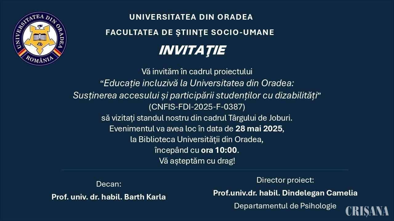 În cadrul proiectului „Educație incluzivă la Universitatea din Oradea: Susținerea accesului și participării studenților cu dizabilități”, miercuri, 28 mai, va avea loc un eveniment organizat de Facultatea de Științe Socio-Umane din cadrul Universității din Oradea.