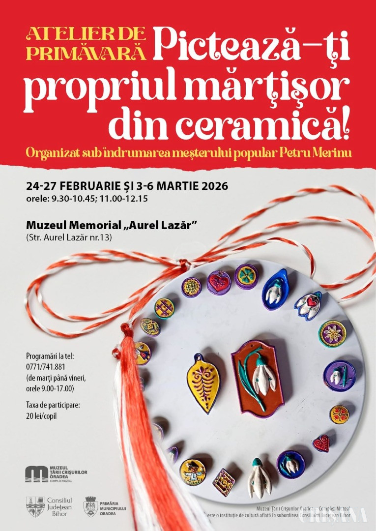 Muzeul Țării Crișurilor Oradea – Complex Muzeal organizează, în parteneriat cu Consiliul Județean Bihor și Primăria Municipiului Oradea, atelierul de primăvară: „Pictează-ți propriul mărțișor din ceramică!”. Atelierele se vor desfășura în perioadele: 24-27 februarie și 3-6 martie, între orele 9.30-10.45 și 11.00-12.15, la sediul Muzeului Memorial „Aurel Lazăr” (str. Aurel Lazăr nr. 13).