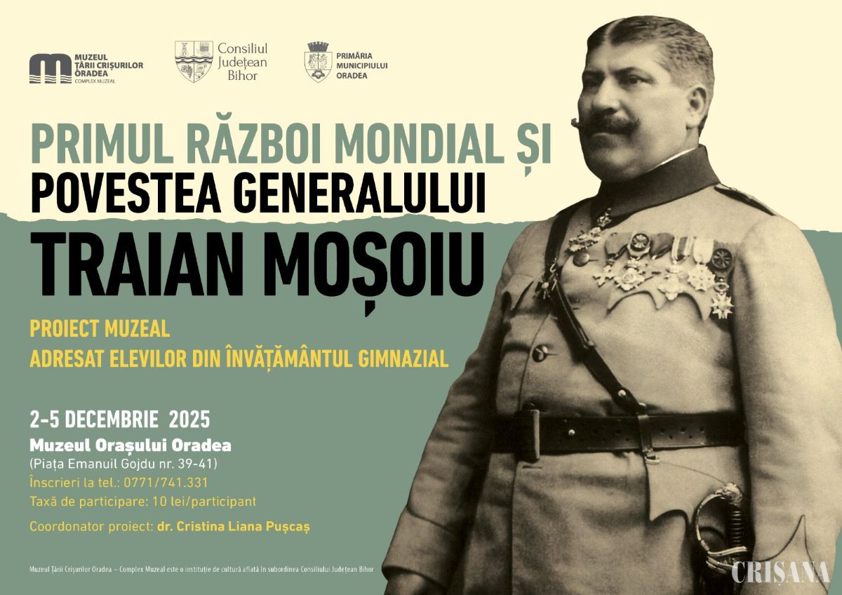 Muzeul Țării Crișurilor Oradea – Complex Muzeal organizează, împreună cu Consiliul Județean Bihor și Primăria Municipiului Oradea, atelierul de educație muzeală „Primul Război Mondial și Povestea Generalului Traian Moșoiu”. Acesta se va desfășura în perioada 2-5 decembrie, la Muzeul Orașului Oradea (Piața Emanuil Gojdu nr. 39-41) și este adresat elevilor din învățământul gimnazial. În cadrul întâlnirii cu elevii, vor fi prezentate aspecte privind Primul Război Mondial, Marea Unire de la 1Decembrie 1918 și personalitatea generalului Moșoiu.