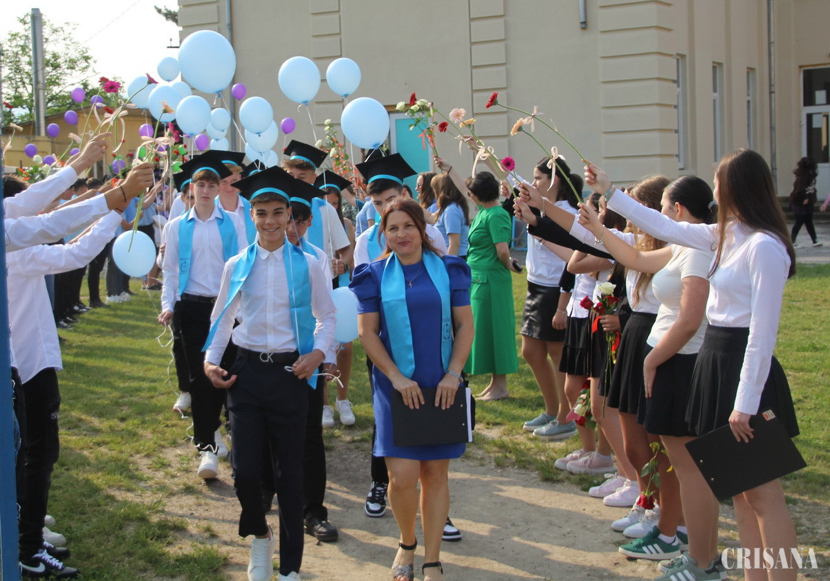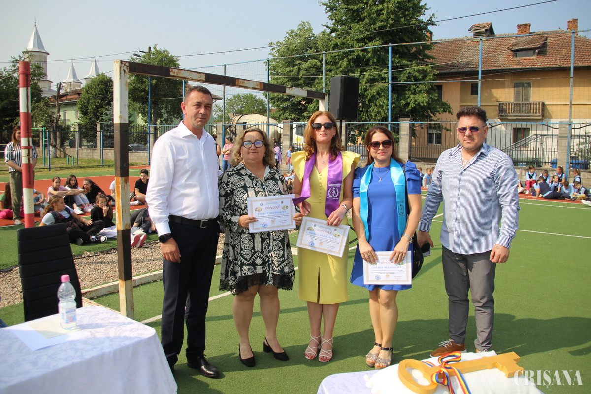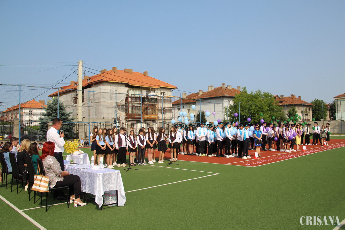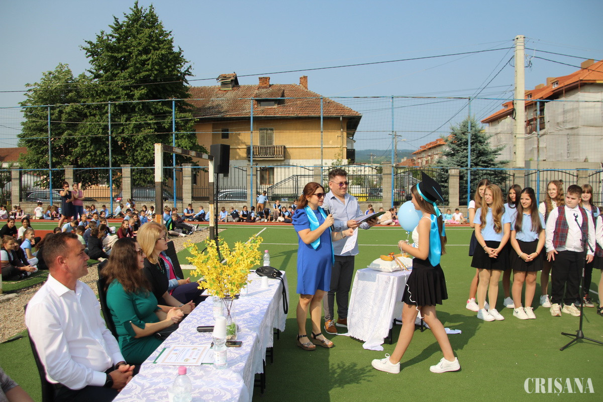 Pregătit la „patru ace”, terenul de sport cu suprafață sintetică a fost gazda festivității de absolvire a elevilor din clasa a opta a acestei instituții de învățământ, care au fost primiți de foștii lor colegii, de acum, din clasele mai mici printr-un adevărat „coridor de flori”. Evenimentul a debutat cu Imnul Național, după care părintele paroh Adrian Suciu a oficiat un Te Deum, ținând un cuvânt de învățătură, mult apreciat de numeroasa asistență compusă din părinți, bunici, rude, colegi, dar și mulți prieteni, care au dorit să fie alături de absolvenți într-o zi aparte din viața lor. Moderatorul evenimentului, prof. Felicia Țoța, responsabil proiecte educative pe școală, a dat dovadă de un spirit organizatoric excelent, la fel, cum, de altfel, a fost și buna organizare, una fără reproș.