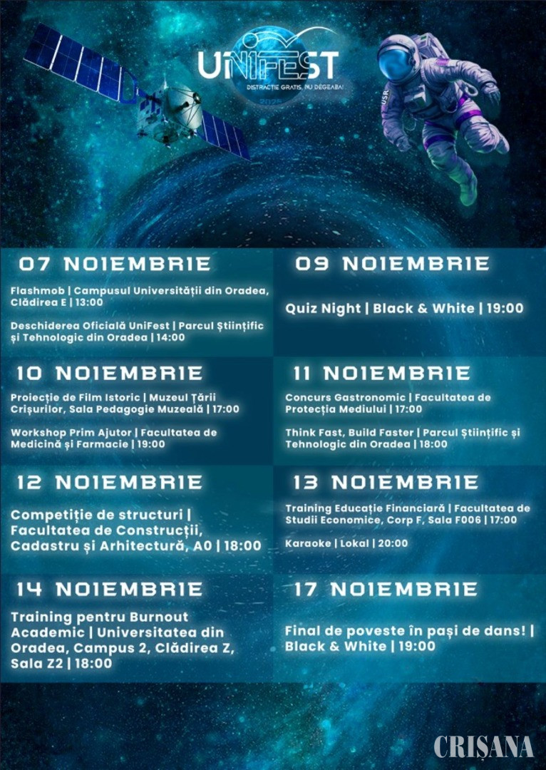 „Deschiderea festivalului este marcată de un FlashMob plin de energie, organizat în fața clădirii E a Universității din Oradea, unde studenții și asociațiile studențești sunt așteptați să dea tonul unei perioade vibrante, pline de zâmbete și voie bună”, spune Ioana Iova, vicepreședintele USR zona de Vest și coordonator zonal al Festivalului UniFest. Tot vineri, în Parcul Științific și Tehnologic Bihor, a avut loc deschiderea oficială a Festivalului UniFEST Oradea, un eveniment caracterizat de organizatori drept „simbolic pentru tot ceea ce va urma”. În aceste zile, participanții se bucură de: workshop-uri, competiții sportive, quiz-uri, karaoke, traininguri, proiecții de film istoric, precum și de numeroase momente de socializare și distracție, menite să consolideze spiritul comunității studențești. „Scopul nostru este să-i facem pe studenți să se distreze, să interacționeze și să se bucure împreună de activitățile diverse pe care le-am pregătit. Toate aceste evenimente sunt organizate în colaborare cu asociațiile studențești din Oradea, care au pus suflet și energie pentru ca UniFEST să fie o adevărată sărbătoare a comunității academice”, explică Ioana Iova. UniFEST este cel mai mare festival studențesc din România, organizat de Uniunea Studenților din România (USR), în parteneriat cu asociațiile studențești din Oradea, cu sprijinul Universității din Oradea și al autorităților locale. Scopul festivalului este de a sărbători viața de student prin activități educative, culturale și distractive, oferind tinerilor oportunitatea de a se dezvolta și de a se conecta într-un cadru plin de energie și creativitate.