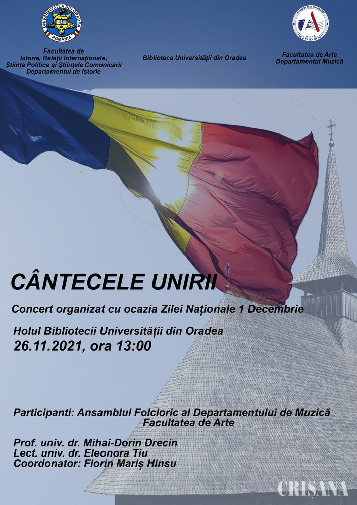 Departamentul de Muzică din cadrul Facultății de Arte, în parteneriat cu Departamentul de Istorie al Facultății de Istorie, Relații Internaționale, Științe Politice și Științele Comunicării și Biblioteca Universității din Oradea vor susține un eveniment festiv dedicat Zilei Naționale a României.