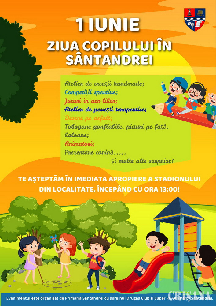 Cu ocazia Zilei Internaționale a Copilului, Primăria Sântandrei invită toți copiii și familiile lor la un eveniment special, plin de bucurie, jocuri și surprize. Evenimentul va avea loc duminică, 1 iunie, în apropierea stadionului din localitate.