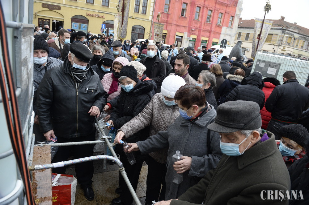 Și la Catedrala greco-catolică „Sfântul Nicolae” din Oradea, evenimentul liturgic s-a desfășurat cu respectarea regulilor impuse de pandemie, iar la toate intrările s-au găsit dezinfectante. Preotul Ovidiu Duma, parohul Catedralei, ne-a declarat că Sfințirea Mare a Apei s-a făcut în cadrul Liturghiei Arhierești, de către Preasfinția Sa Virgil Bercea, episcopul greco-catolic de Oradea, înconjurat de un sobor de preoți. „Am pregătit în jur de 1.400-1.500 de litri de apă”, a precizat părintele Ovidiu Duma.