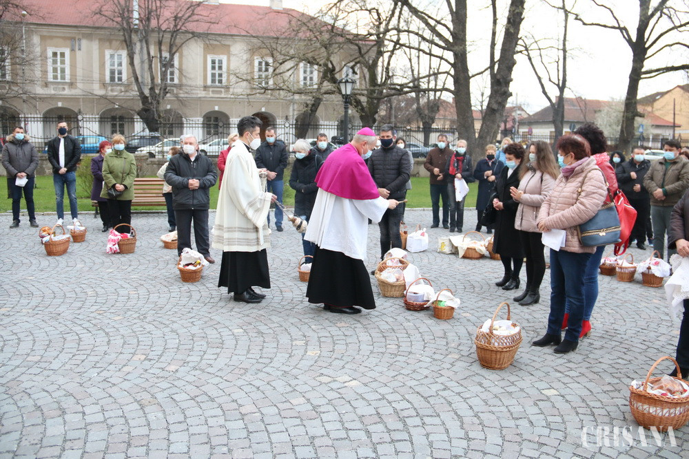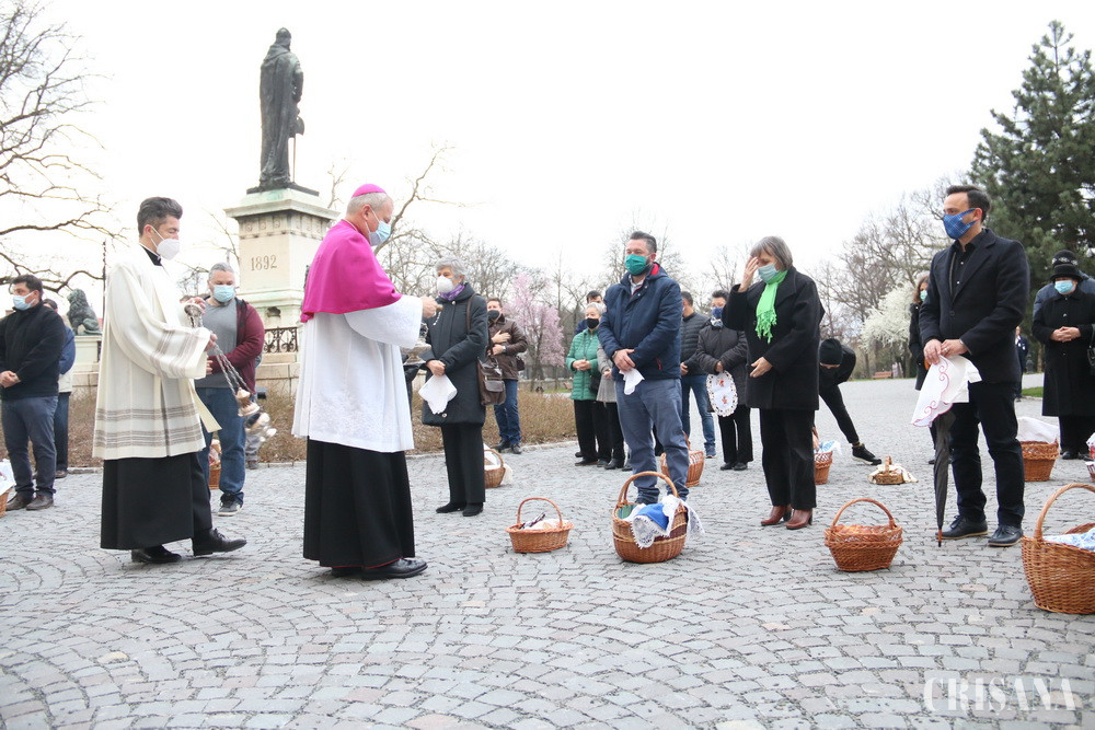 Dimineața, de la ora 7.30, pe platoul din fața catedralei episcopale din Oradea (Grădina Palatului Baroc), în jur de 150 de persoane au așteptat cu coșurile împletite din nuiele, pline cu bucate, ca acestea să fie binecuvântate de episcopul László Böcskei.