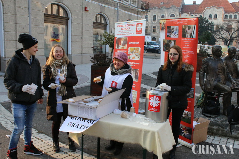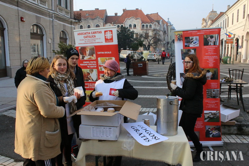 Doi reprezentanți ai Asociației Caritas Catolica Oradea și trei elevi proveniți de la Internatul Caritas i-au servit, ieri, cu gogoși și ceai cald pe orădenii care s-au aflat în trecere pe Pietonala orădeană, în apropiere de Grupul statuar al poeţilor maghiari. Acţiunea s-a desfășurat în cadrul maratonului caritabil organizat cu ocazia sărbătorilor de Caritas Catolica Oradea, ca încheiere a Sfântului An al Milostivirii.