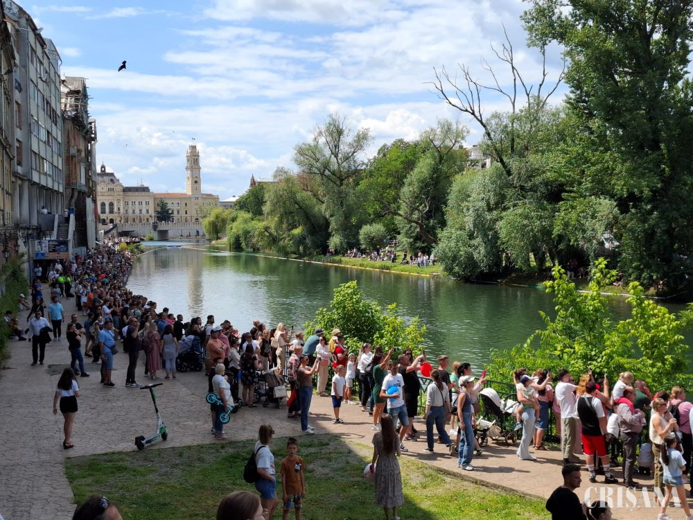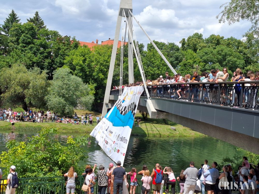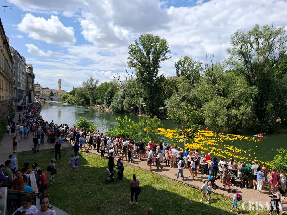 Mii de rățuște de cauciuc au luat ieri startul pe apele Crișului Repede, într-o competiție plină de culoare și bună dispoziție. Ambele maluri ale râului au fost ocupate de sute de părinți și copiii dornici să urmărească competiția.