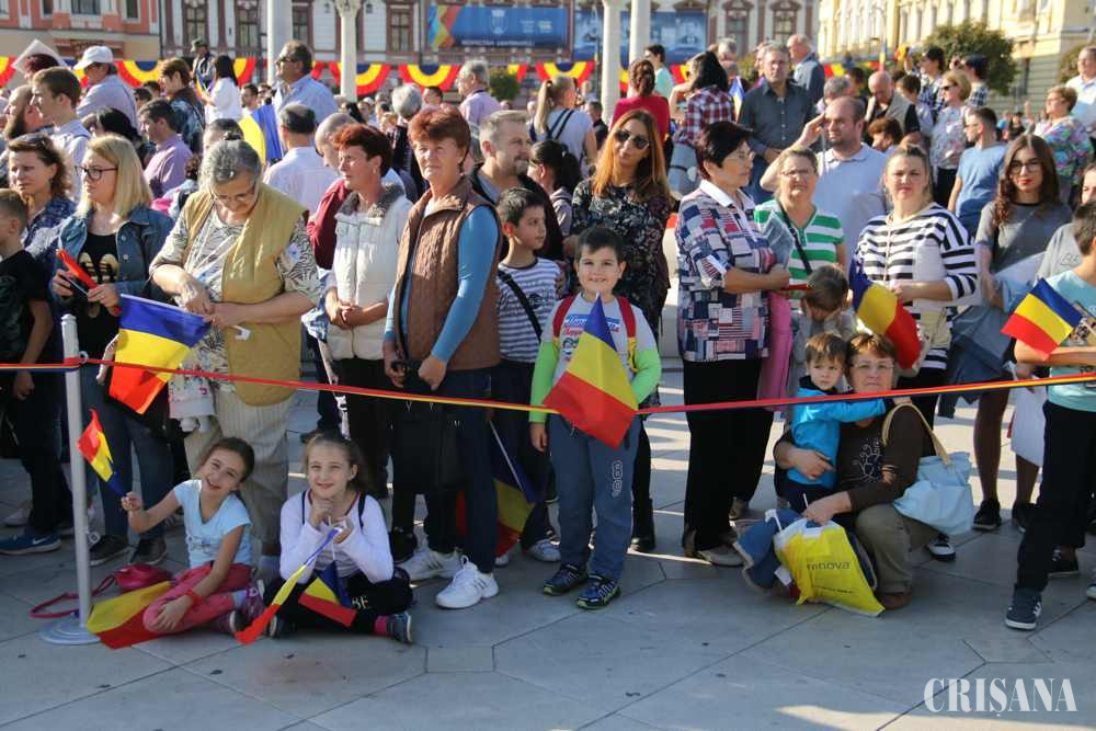 Oraș împodobit în tricolor, mii de oameni cu steaguri, școlari în grupuri compacte și polițiști și jandarmi la fiecare colț de stradă, așa a arătat vineri, în jurul orei 15.00, atmosfera din Piața Unirii, la cea mai importantă zi pentru municipiu, ziua Oradiei.