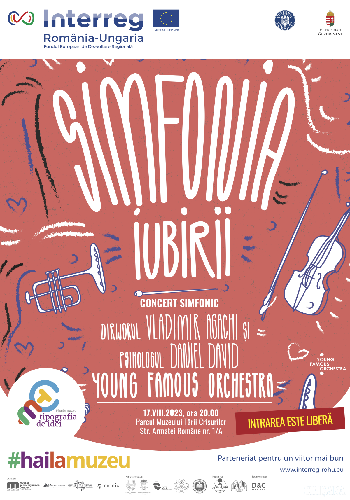Evenimentul va avea loc joi, 17 august, începând cu ora 20.00, în parcul Muzeului Țării Crișurilor (Str. Armatei Române nr.1/A). „Simfonia Iubirii” propune publicului puterea transformatoare a muzicii (#healingmusic), transmițându-i faptul că aceasta ne însoțește în fiecare etapă a vieții, ne ajută să ne înțelegem trăirile și să le integrăm armonios în evoluția noastră (#musiceducation). Publicul este un personaj implicat activ în acest proces construit pe dialogul dintre artă și știință, minte și suflet, rațional și ipotetic, concret și abstract - fiind parte din dialog. Repertoriul alcătuit cu atenție va cuprinde atât piese cunoscute și iubite de public, ce sunt deja asociate cu „Simfonia Iubirii”, dar și noi opțiuni care să susțină ideea de unicitate a fiecărei reprezentații artistice. Piesele selectate vor purta spectatorul într-o călătorie ce-i va permite să-și descopere, să-și explice și să-și înțeleagă trăirile prin prisma psihologiei pozitive, fiind ghidat în acest demers de prelegerile susținute de reputatul psiholog Daniel David.