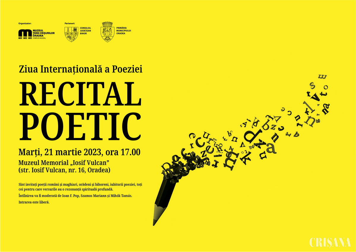 Cu acest prilej, Muzeul Țării Crișurilor Oradea - Complex Muzeal, în parteneriat cu Consiliul Județean Bihor și Primăria Municipiului Oradea, organizează marți, 21 martie, a.c., ora 17.00, la sediul Muzeului Memorial „Iosif Vulcan” (str. Iosif Vulcan, nr. 16), un recital poetic dedicat acestei zile. La această sărbătoare a poeziei sunt invitați poeții români și maghiari, orădeni și bihoreni, iubitorii acesteia, toți cei pentru care versurile au o rezonanță spirituală profundă. Fiecare poet prezent va citi un poem, punând în valoare valențele nelimitate ale poeticității, zestrea poeziei orădene și bihorene. „Poezia este obsesia esențialității dusă în absolutul cuvîntului. Ea este umbra crepusculară a timpului pe care încercăm să o umplem cu ecoul unor trăiri, zăcământul aurifer din adâncul ființei care, printr-un miracol, poate ieși la suprafața exprimării sintetice. Poezia se joacă cu propriile posibilități ale limbajului, ea nu este decât un pas făcut în vacuitatea ne-spusului. Poezia este o altă limbă, una extrasă din nectarul cuvintelor. Doar în poezie poți spune aproape totul cu puținătatea unor propoziții. Inspirația nu este decât forma poematică în care se manifestă gândirea. Gândirea este propria ei poezie. După cum poezia duce gândirea în propria ei sărbătoare inspirațională. Poezia – un mod unic de a coborî în noi înșine pe scara de urgență a cuvintelor”. (Ioan F. Pop). Întâlnirea va fi moderată de Ioan F. Pop, Szamos Mariann și Mihók Tamás. Intrarea este liberă.