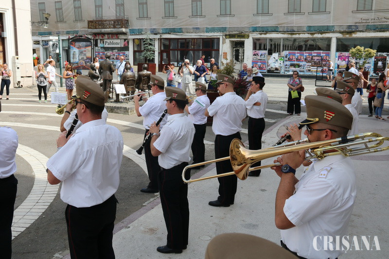 Înainte de a urca, vineri seara, pe scena Filarmonicii de Stat Oradea, Fanfara Militară Szekesfehervar, din Ungaria, dirijată de maiorul Ruff Tamas, a prezentat câteva marșuri militare, lângă grupul statuar de lângă Liceul Ady Endre, spre încântarea trecătorilor.