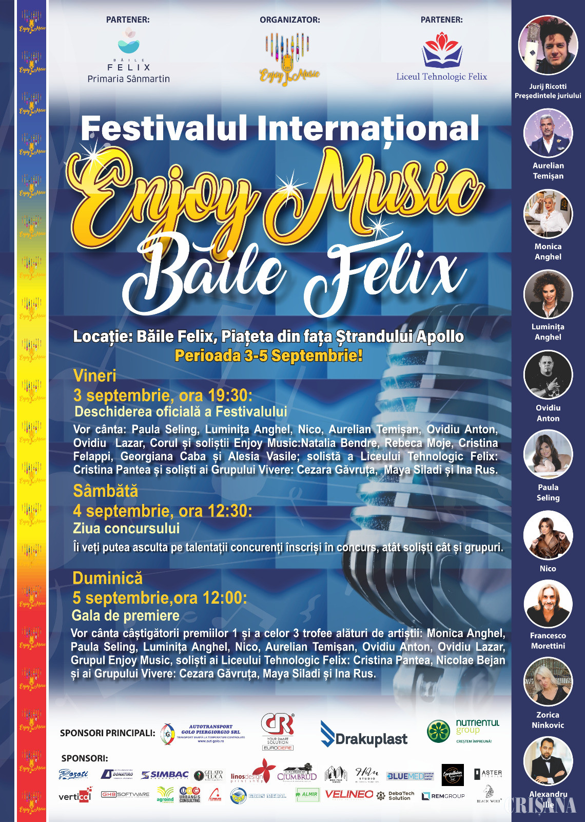 Prima ediție a Festivalului Internațional de Muzică Ușoară „Enjoy Music” Băile Felix va avea loc în weekendul 3-5 septembrie, în stațiunea Băile Felix, în Piațeta de lângă Ștrandul Apollo. Evenimentul este organizat de Asociația Enjoy Music, în parteneriat cu Primăria comunei Sânmartin și Liceul Tehnologic „Felix”.