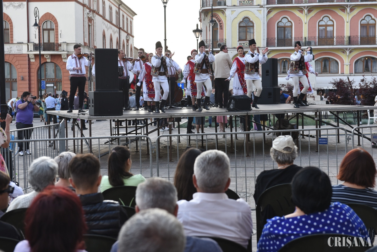 Zona din fața Teatrului Regina Maria a fost plină miercuri, la ora 19.00, când pe scenă a urcat Ansamblului Artistic Profesionist Crișana. A urmat o surpriză din partea actorilor orădeni care au prezentat mai multe scene muzicale din unul din cele mai de succes spectacole, „Scripcarul de pe acoperiș”. În aplauzele orădenilor care s-au înghesuit să fotografieze și să filmeze cu telefoanele, pe scenă a urcat Grupul Iza.