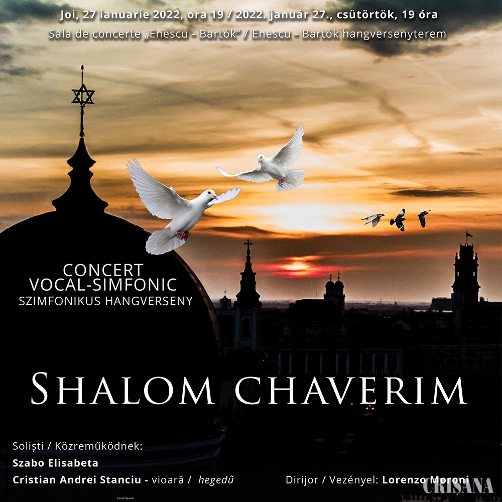 Filarmonica de Stat Oradea îi invită pe orădeni la un concert dedicat Zilei Internaționale de Comemorare a Victimelor Holocaustului, stabilită pe 27 ianuarie. Concertul poartă titlul „Shalom chaverim” și va avea loc joi, chiar în data de 27, la ora 19.00 în sala de concerte Enescu - Bartók. La pupitrul orchestral se va afla Lorenzo Moroni, iar soliștii serii vor fi Szabo Elisabeta și Cristian Andrei Stanciu, la vioară. Programul cuprinde 9 piese de origine sau cu tematică ebraică. Atmosfera este sugerată încă din titlu, Shalom chaverim fiind numele unui cântec tradițional evreiesc, care în traducere însemnă „Pace, prietenii mei”. Piesa care deschide concertul este intitulată „Israel Shalom” și aparține compozitorului Kees Vlak. Aceasta este o rapsodie dedicată statului modern Israel, care cuprinde numeroase teme folclorice prelucrate. Genul rapsodiei se păstrează și în piesa următoare „Shirim”, aparținând lui Piet Swerts. De data aceasta însă, este abordată tradiția muzicii Klezmer. Aceasta este muzica tradițională a evreilor Așkenazi, prezenți în Europa Centrală și de Est și include elemente din melodiile de dans și cele rituale, cântate în special la nunți și la alte evenimente. Genul Klezmer include influențe multiple, precum greacă și română, slavă și germană, având la bază muzica ebraică. Cea de-a treia piesă a serii include apariția în scenă a solistei Elisabeta Szabo, care va interpreta cântecul Yosl, yosl. Acesta a fost scris de Nellie Casman și soțul acesteia, Samuel Steinberg, piesa câștigându-și faima în anul 1938, atunci când a fost cântat în engleză cu titlul Joseph, Joseph. O altă piesă cu specific vocal care va fi adusă publicului va fi Abi Gesunt (În sănătatea ta), de origine folclorică. În aceeași sferă a muzicii Klezmer, piesa Klezmer Classics a compozitorului Johann de Mey reunește 5 piese tradiționale, orchestrate pentru o formație de suflători. În continuare, în programul concertului se află coloana sonoră a filmului Schindler's List , compusă de John Williams. Filmul istoric are ca temă holocaustul, iar muzica ce îl însoțește a fost compusă în anul 1993. În concertul orădean, la vioară se va afla solistul Cristian Andrei Stanciu. Revenind la muzica tradițională, orchestra va interpreta Klezmer Carnival de Philip Sparke. Precum reiese din titlu, lucrarea îmbină culorile muzicii Klezmer, prin 3 piese cu specific de nuntă sau de dans. Solista Elisabeta Szabo revine pe scenă în cele ce urmează, pentru a interpreta piesa „Bei Mir Bistu Shein”. Melodia populară datează din anul 1932, versurile aparținând lui Jacob Jacobs, iar muzica lui Sholom Secunda. Aceasta a fost scrisă pentru un musical de comedie și s-a extins pe plan internațional 5 ani mai târziu, atunci când a fost înregistrată sub titlul german „Bei mir bist du schön” (Pentru mine ești frumos). Un alt cântec, foarte cunoscut printre evreii care au locuit în România, este „Rumanie, Rumanie”. Acesta a fost compus de Aaron Lebedeff și descrie mâncarea gustoasă din România și viața frumoasă care putea fi trăită pe aceste meleaguri înainte de război. Muzica incidentală revine odată cu interpretarea temelor din musicalul „Fiddler on the Roof” de Jerry Bock. Tema cuprinde numeroase povești ale poporului evreu, iar fondul muzical a fost asigurat de Jerry Bock în anul 1964. Seara se va încheia cu o continuare a Carnavalului Klezmer, mai exact cu lucrarea „Three Klezmer Miniatures” a compozitorului Philip Sparke. Printre acestea se află un dans circular evreiesc, un cântec de dragoste și faimoasa piesă „Hava Nagila” (Să ne bucurăm), la origine fiind un dans popular al evreilor.