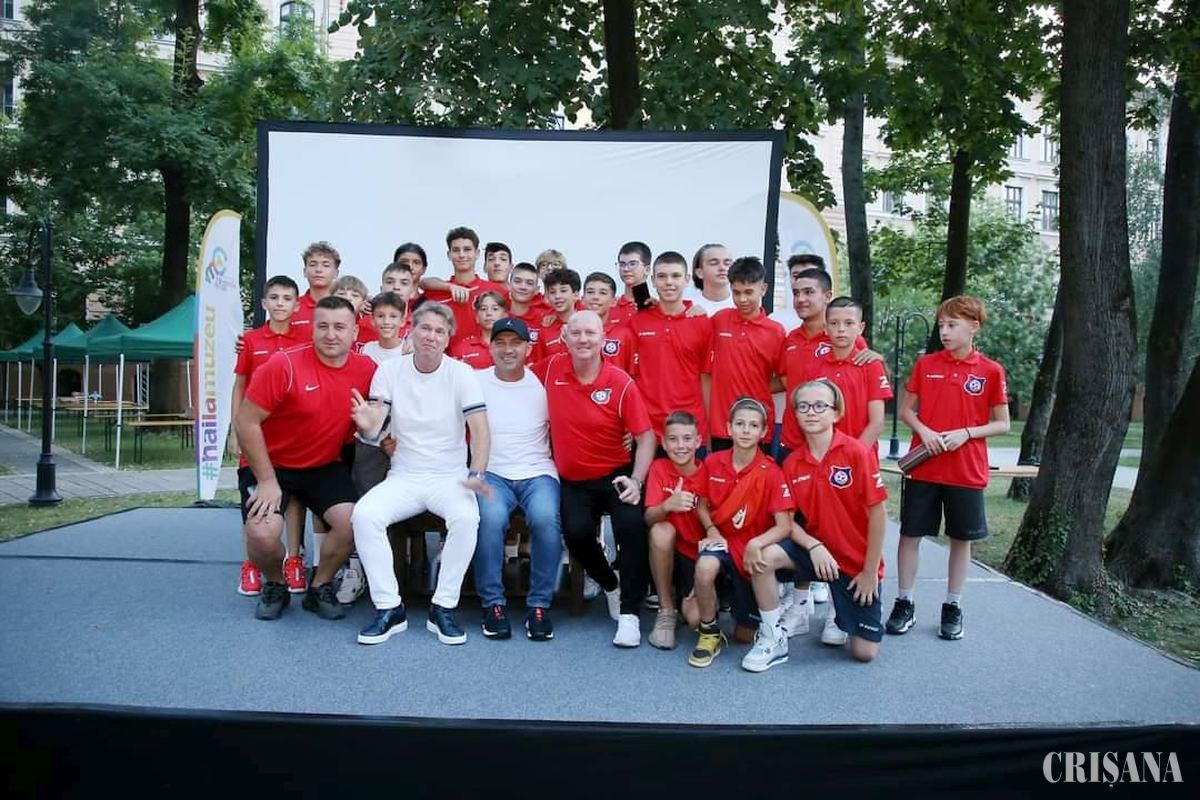 Evenimentul a avut loc vineri seara, în parcul Muzeului Ţării Crişurilor (MTC), în cadrul programului estival al muzeului numit „Tipografia de idei”, ediţia a II-a. Florin Răducioiu şi Jean Vlădoiu, foşti fotbalişti internaţionali şi membri ai generaţiei de aur, s-au întâlnit cu suporterii în cadrul unei conferințe tematice. Moderatorul evenimentului a fost managerul complexului muzeal MTC, prof. univ. dr. Gabriel Moisa. Ulterior conferinţei a avut loc proiecţia filmului „Hai, România! - Povestea Generaţiei de Aur", regizat de Claudiu Mitcu, după un scenariu semnat de scriitorul Andrei Crăciun. Documentarul sportiv îi are ca protagonişti pe cei care au fost, pe bună dreptate, consideraţi a fi ,,generaţia de aur” a fotbalului românesc prin prisma rezultatelor extraordinare obţinute în perioada 1980-2000. Este perioada în care echipa naţională a României a ajuns pe locul trei în lume în clasamentul FIFA şi a reuşit recordul a trei calificări consecutive la trei campionate mondiale (1990-1994-1998) şi două calificări consecutive la două campionate europene de fotbal (1996 şi 2000). Florin Răducioiu, atacantul central al echipei naţionale, a fost prezent la campionatele mondiale din 1990 şi 1994, unde a marcat patru goluri, dar şi la europeanul din 1996, unde a marcat un gol. Este singurul fotbalist român care a evoluat în toate marile campionate naţionale ale Europei (Italia, Spania, Anglia, Germania şi Franţa), iar la echipa naţională a strâns 40 de meciuri jucate, marcând 21 de goluri. În martie 2008 a fost decorat cu Ordinul „Meritul Sportiv” clasa a III-a pentru rezultatele obţinute la turneele finale din perioada 1990-2000 şi pentru întreaga activitate. Jean Vlădoiu, combativul atacant al reprezentativei României prezent la mondialul din 1994 şi europeanul din 1996, a avut 28 de selecţii şi a marcat două goluri pentru echipa naţională. De-a lungul carierei a evoluat cu succes la toate cele trei mari echipe din capitală (Rapid, Steaua şi Dinamo), dar şi o perioadă în campionatul german. La fel ca alţi membri ai naţionalei, a fost şi el decorat cu Ordinul „Meritul Sportiv” clasa a III-a, pentru rezultatele obţinute la turneele finale din perioada 1990-2000 şi pentru întreaga activitate.