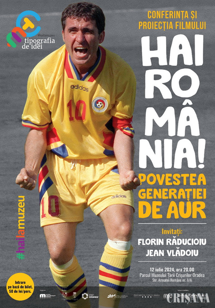 În cadrul Tipografiei de idei | #hailamuzeu, ediția a II-a, vineri, 12 iulie, de la ora 20.00, în parcul Muzeului Țării Crișurilor (str. Armatei Române nr. 1/A), va avea loc conferința și proiecția filmului „Hai, România! Povestea Generației de Aur”.