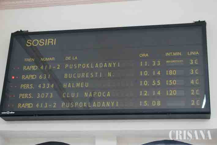 Circulaţia trenurilor din întreaga ţară a fost blocată ieri dimineaţă şi chiar dacă din Oradea nu a plecat cu întârziere decât trenul intercity Cluj-Napoca - Timişoara, şi aceasta de doar câteva minute, cele care trebuia să sosească din alte oraşe au suferit întârzieri care au depăşit, cumulat, 700 de minute. Astfel, intercity-ul de pe relaţia Timişoara - Cluj-Napoca a avut o întârziere de 170 de minute, acceleratul Timişoara - Iaşi, 110 minute, personalul Timişoara - Oradea, 85 de minute, rapidul Bucureşti - Oradea a avut întârzieri de 150 de minute, personalul Cluj-Napoca - Oradea a avut întârzieri de aproximativ 120 de minute, iar cel de pe relaţia Halmeu - Oradea, 150 de minute, menţionează Cristina Derban, şef Staţie CFR Călători. La toate aceste întârzieri s-au mai adăugat şi cele ale trenurilor care trebuia să sosească din Ungaria, angajaţii transportului feroviar din această ţară fiind şi ei în grevă de la ora 4.00, ora României. Un tren internaţional Puspokladani - Oradea care avea sosirea, ieri, la ora 11.33, avea afişată o întârziere... necunoscută.