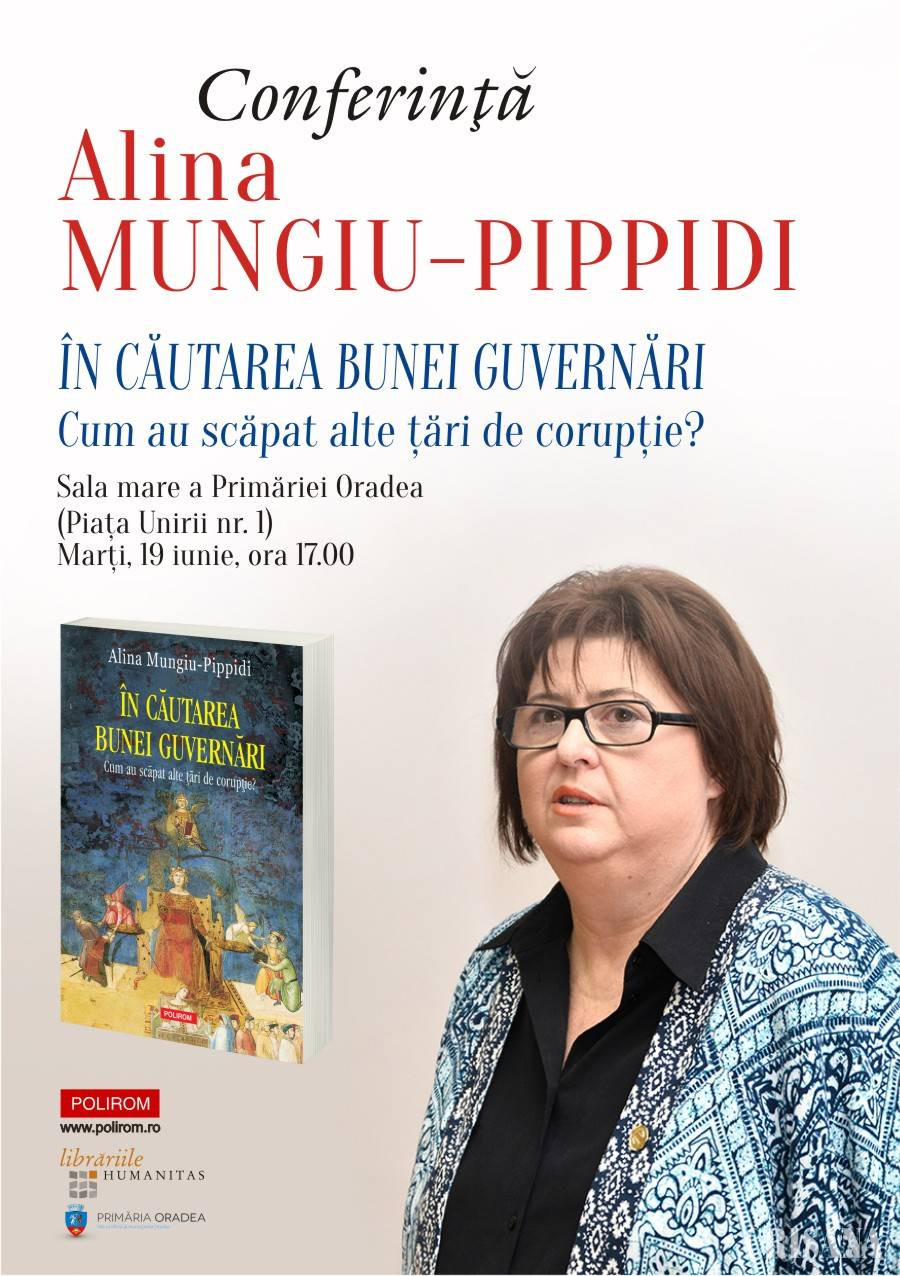 Marti, 19 iunie, de la ora 17.00, în sala mare a Primăriei Oradea va avea loc conferinţa ,,În cautarea bunei guvernări - Cum au scăpat alte ţări de coruptie?”, susţinută de Alina Mungiu - Pippidi.