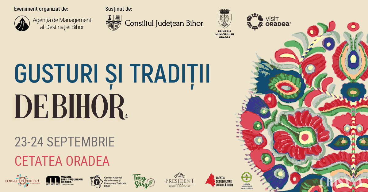 „Gusturi și Tradiții de Bihor” va avea loc în perioada 23 – 24 septembrie, între orele 13.00 și 22.00, și este organizat de Asociația de Management a Destinației, instituție din subordinea Consiliului Județean Bihor.