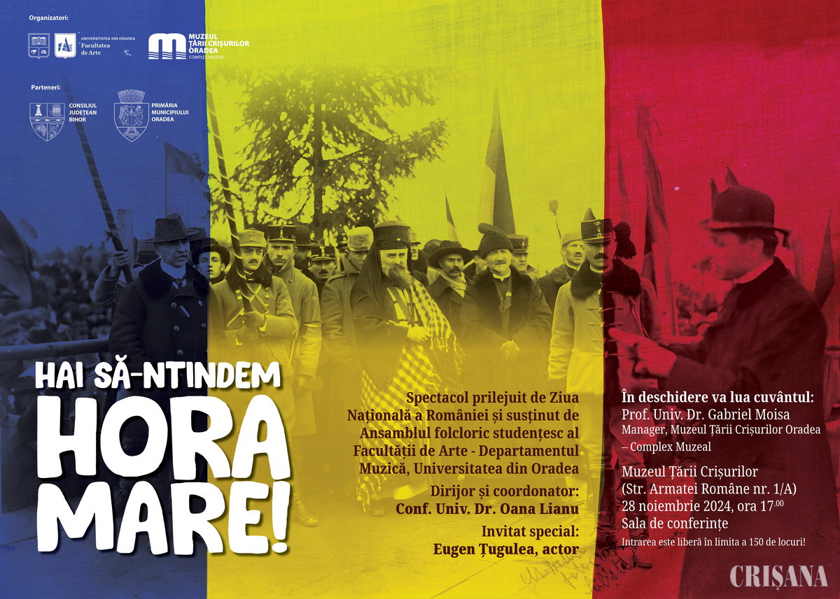 Ziua Națională a României va fi serabată cu muzică la Muzeul Țării Crișurilor. Spectacolul „Hai să-ntindem hora mare!” va fi susținut de Ansamblul folcloric studențesc al Facultății de Arte.