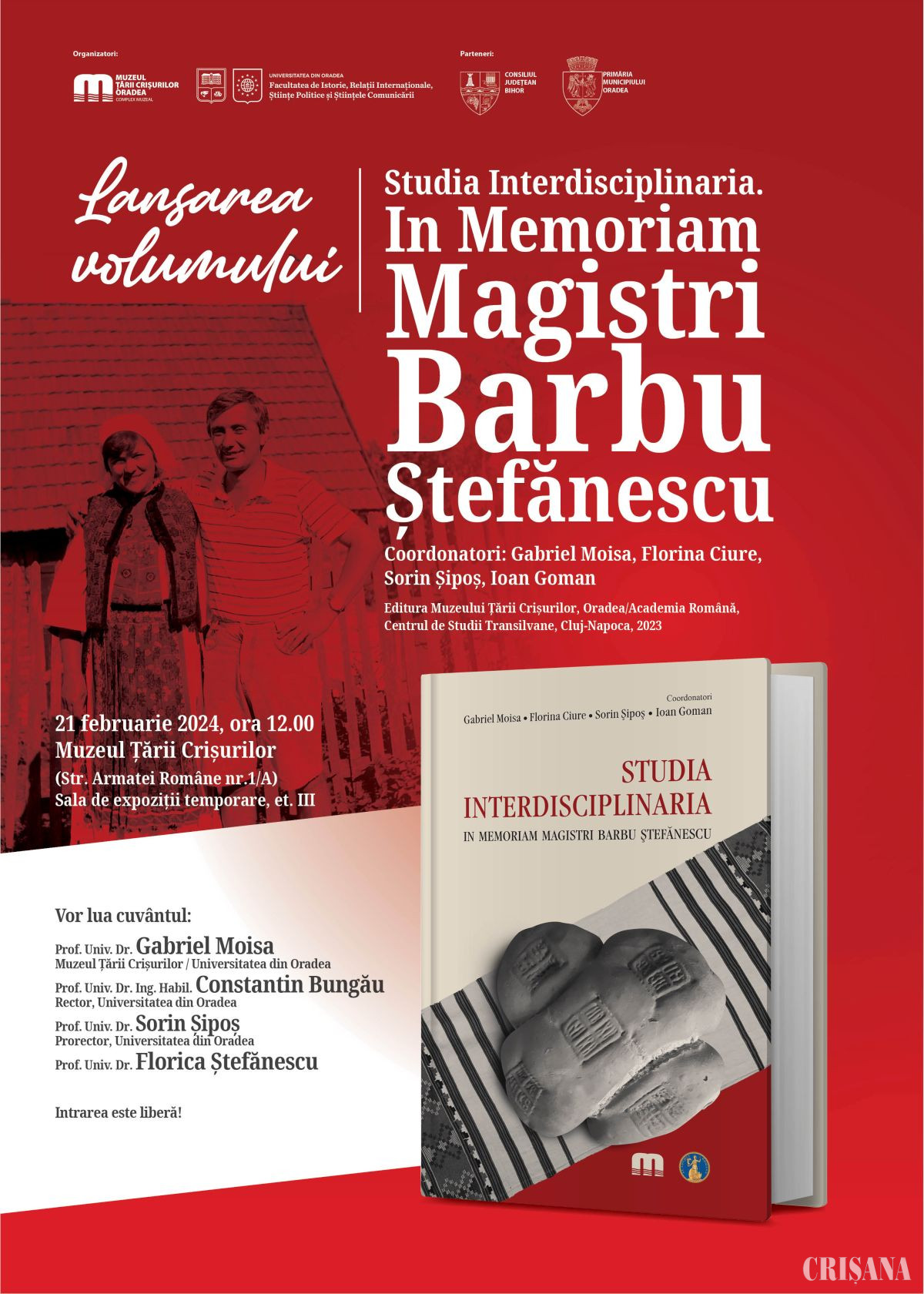 La sediul Muzeul Țării Crișurilor Oradea, miercuri, 21 februarie, de la ora 12.00, va avea loc lansarea volumului „Studia Interdisciplinaria. In memoriam Magistri Barbu Ștefănescu”.