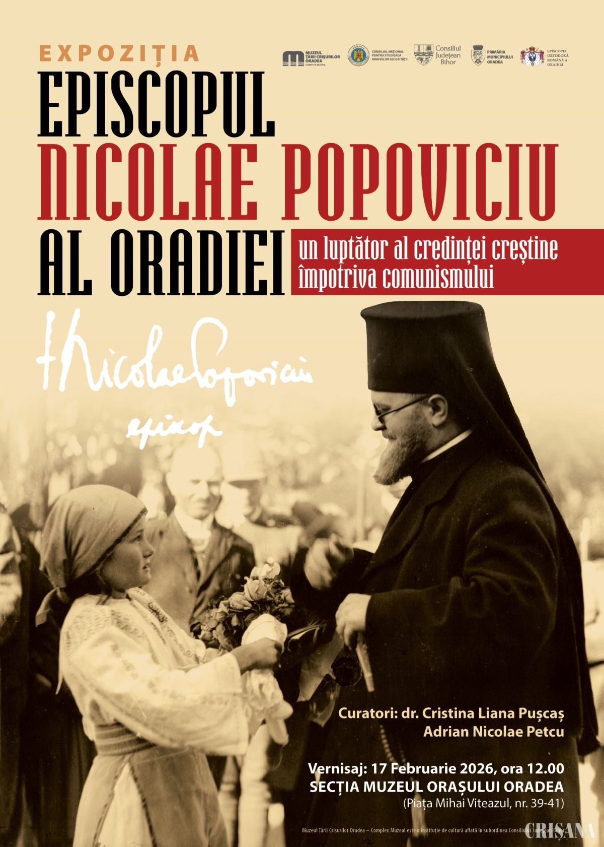 Muzeul Țării Crișurilor Oradea – Complex Muzeal, în parteneriat cu Consiliul Național pentru Studierea Arhivelor Securității, Consiliul Județean Bihor, Primăria Municipiului Oradea și Episcopia Ortodoxă a Oradiei, vă invită la deschiderea expoziției „Episcopul Nicolae Popoviciu al Oradiei. Un luptător al credinței creștine împotriva comunismului”. Evenimentul va avea loc marți, 17 februarie, ora 12.00, la Secția Muzeul Orașului Oradea (Piața Mihai Viteazul nr. 39-41).