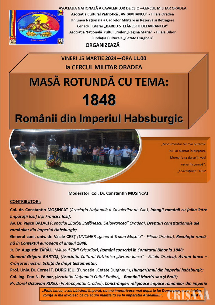 La Cercul Militar, str. Mihai Eminescu nr. 5, va avea loc vineri, 15 martie, de la ora 11.00, o masă rotundă cu tema „1848 - Românii din Imperiul Habsburgic”.