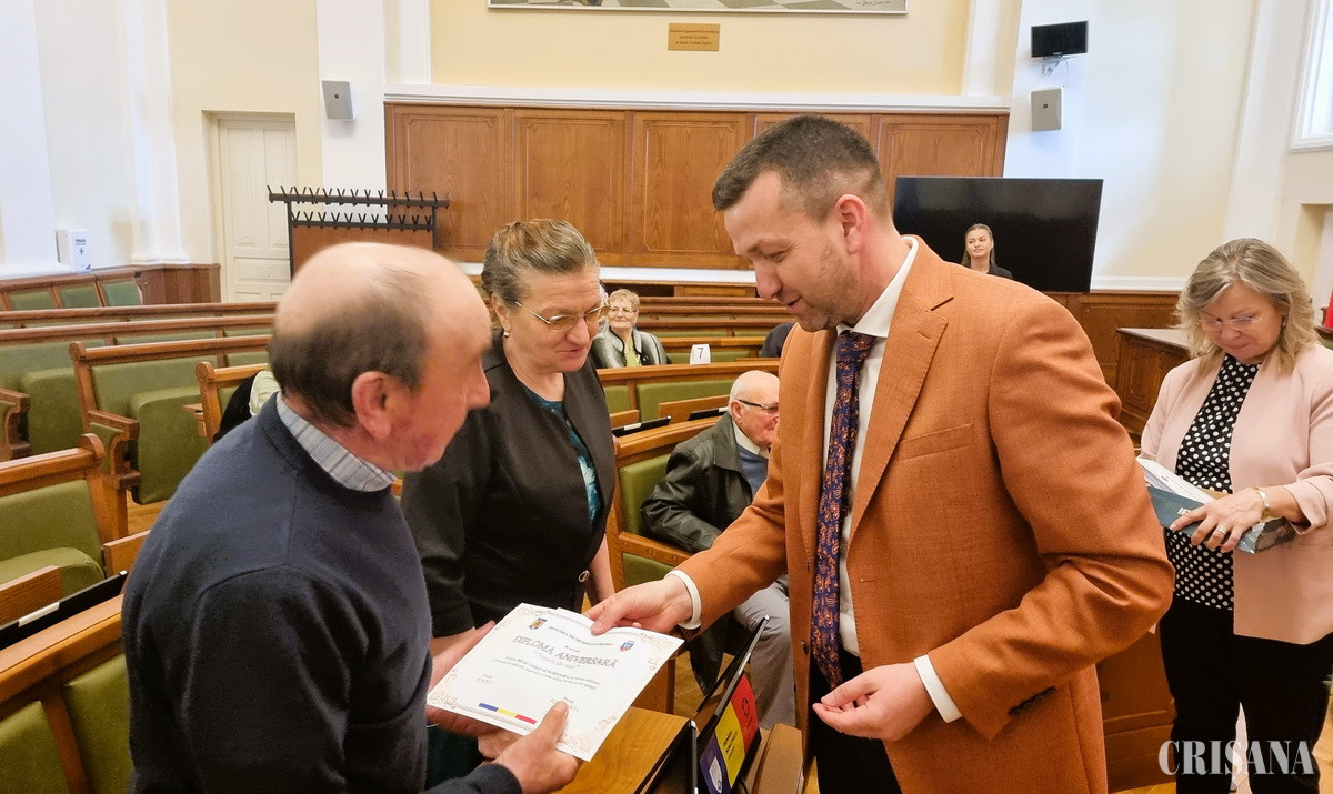 „Mă bucur să văd că ați venit însoțiți de cei dragi, de familie, de nepoți. Mă bucur să o avem alături de noi pe doamna deputat Arina Moș, fost viceprimar al orașului, care a venit astăzi la Oradea pentru a-și felicita părinții ce aniversează 50 de ani de căsnicie. În numele meu, al Primăriei Oradea și al Consiliului Local, vă felicit și vă doresc multă sănătate și tot binele din lume, alături de cei dragi. Știm că într-o căsnicie treci atât prin momente bune, cât și prin altele mai dificile. Dvs. sunteți cei care ați rămas mereu uniți, iar azi sunteți aici pentru a celebra acest parcurs împreună. Sunteți un model pentru noi, pentru că societatea s-a schimbat, iar adevăratele valori nu sunt ușor de păstrat. Felicitări tuturor!”, a menţionat primarul Florin Birta.