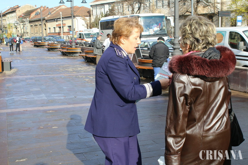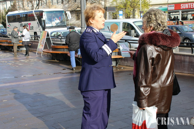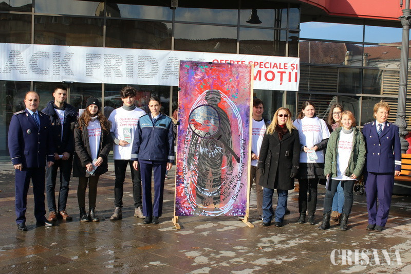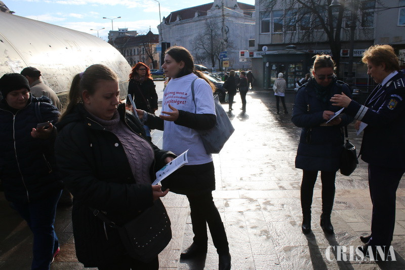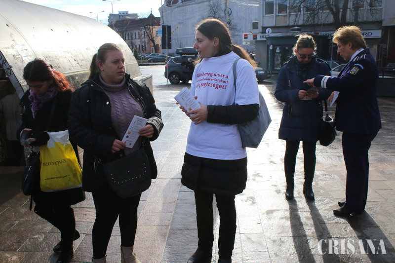 În cadrul campaniei de informare şi prevenire a violenţei în familie „Opreşte acum violenţa în familie. Cere ajutor!”, ieri, la Oradea, a avut loc o acţiune stradală desfăşurată cu sprijinul elevilor de la Liceul de Arte Oradea, al celor de la Liceul Reformat „Lorántffy Zsuzsanna” Oradea şi al reprezentanţilor Poliţiei, care au împărţit pliante şi au încurajat oamenii să nu rămână indiferenţi la violenţa în familie, chiar dacă nu-i afectează personal.