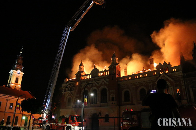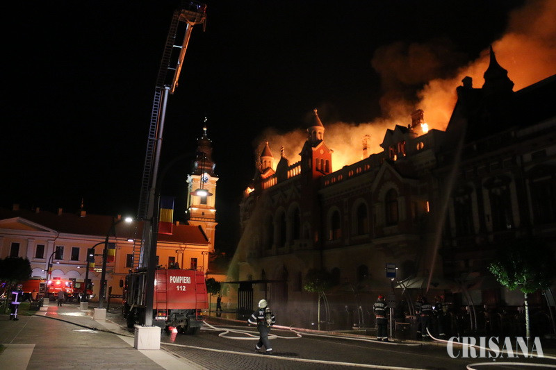 Scene şocante în centrul Oradiei. Acoperişul sediului Episcopiei greco-catolice din Oradea a fost cuprins de flăcări. Incendiul este urmărit de sute de orădeni aflaţi în Piaţa Uniri. Zeci de echipaje de pompieri aruncă apă pe clădire şi pe imobilele învecinate pentru a preveni extinderea incendiului.
