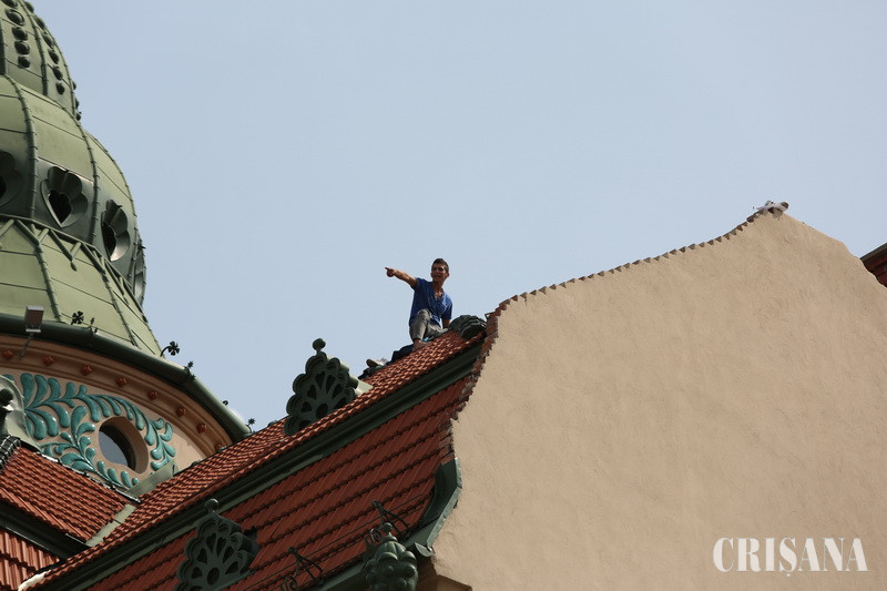 Un tânăr se află de aproximativ două ore pe acoperişul Palatului Vulturul Negru ameninţând că se aruncă în gol. Un echipaj de la SMURD, jandarmi şi poliţişti se află la faţa locului, iar un negociator a urcat pe acoperiş. Pompierii au adus şi o scară telescopică cu platformă pentru a-l da jos pe tânăr, însă acesta s-a ridicat în picioare pe acoperiş strigând că se aruncă. Pompierii au dat înapoi, autovehiculul fiind îndepărtat. Zeci de curioşi s-au oprit în Piaţa Unirii pentru a face poze cu telefoanele mobile.
