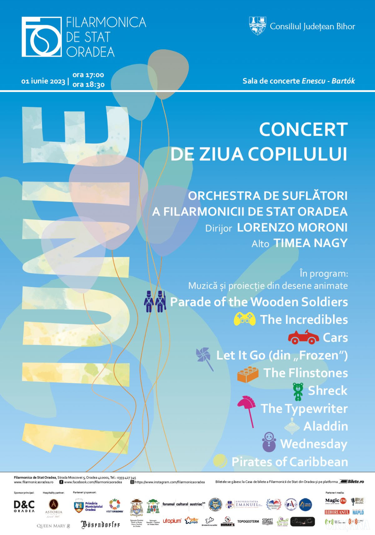 Programul este gândit pe baza desenelor animate și a filmelor pentru copii, câteva dintre titlurile regăsite în concertul Filarmonicii fiind: „Cars”, „Shreck”, „Pirates of the Caribbean” sau „The Flinstones”. Membrii Orchestrei Filarmonicii de Stat Oradea se vor bucura să încânte copiii cu magia muzicii, chiar de ziua lor. Alături de ei, dirijorul Lorenzo Moroni și solista Timea Nagy vor face parte din povestea concertului de 1 iunie!