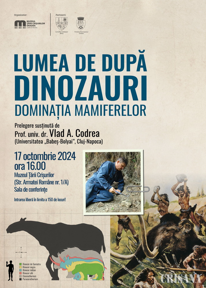 Prelegerea „Lumea de după dinozauri” prezintă inclusiv în imagini istoria frământată a ocupării de către mamifere a nișelor ecologice dominate anterior de dinozauri, precum și diversificarea evolutivă respectivă. De asemenea, sunt incluse date de paleogeografie și de paleoclimă, inclusiv din România, bazate pe fosile de polen și spori. Dintre faunele din România, se disting cele mai vechi mamifere neozoice din Europa de Est (multituberculate și insectivore). Se mai remarcă reflectarea în faunele și florele din România a bio-evenimentului dintre perioadele eocen-oligocen, inclusiv prin prezența unor tapiri, rinoceri giganți (Indricotheri), unii dintre ei fiind mai mari chiar decât girafele actuale, Chalicoteri, rozătoare, carnivore, Entelodon (un gen de porc preistoric uriaș), lemurieni etc. Rezultatele prezentate au fost obținute prin proiecte finanțate de National Geographic Society și Ministerul Cercetării din România. Prelegerea se adresează atât specialiștilor, cât și publicului larg, interesat de tema prezentată. Intrarea este liberă în limita a 150 de locuri.