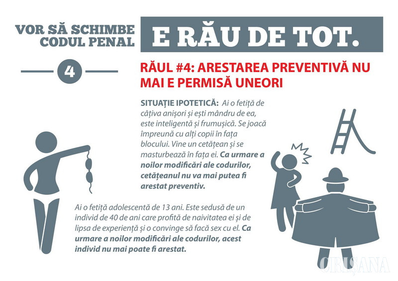 Geeks for Democracy, un grup civic care reuneşte specialişti din mai multe domenii, a făcut o ilustrare grafică a felului cum modificările propuse la Codul Penal limitează drastic mijloacele de anchetă ale procurorilor, avantajând inculpaţi, şi cum cei care au de suferit în cele din urmă sunt cetăţenii obişnuiţi. Ilustrarea a fost făcută pe baza unui document făcut de Asociaţia Procurorilor, care conţine textul amendamentelor propuse, puse în oglindă cu articolele actuale din codurile penale.