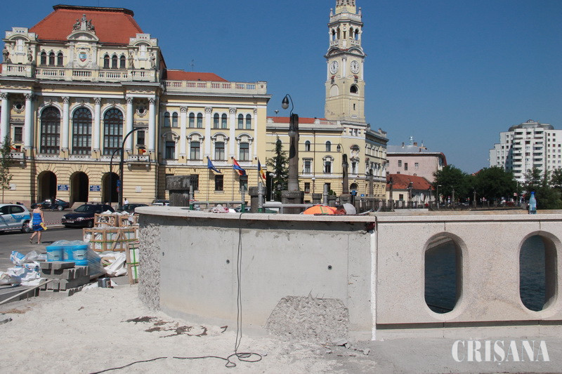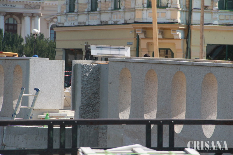Muncitorii spărgeau ieri de zor coloanele de beton în exteriorul plafonului de rulare, în zona balcoanelor. Este pentru a doua oară când muncitorii firmei cehe care execută lucrările, sparg betonul proaspăt turnat din cauza unor erori de proiectare. Astfel, după ce au montat luna trecută dalele de piatră pe trotuarul dinspre Primăria Oradea, s-a constatat că au fost montate greşit, panta de scurgere (înclinaţia trotuarului către carosabil) fiind mult prea mare. Astfel, toate dalele au fost scoase, betonul spart şi adus la înclinaţia corespunzătoare.
