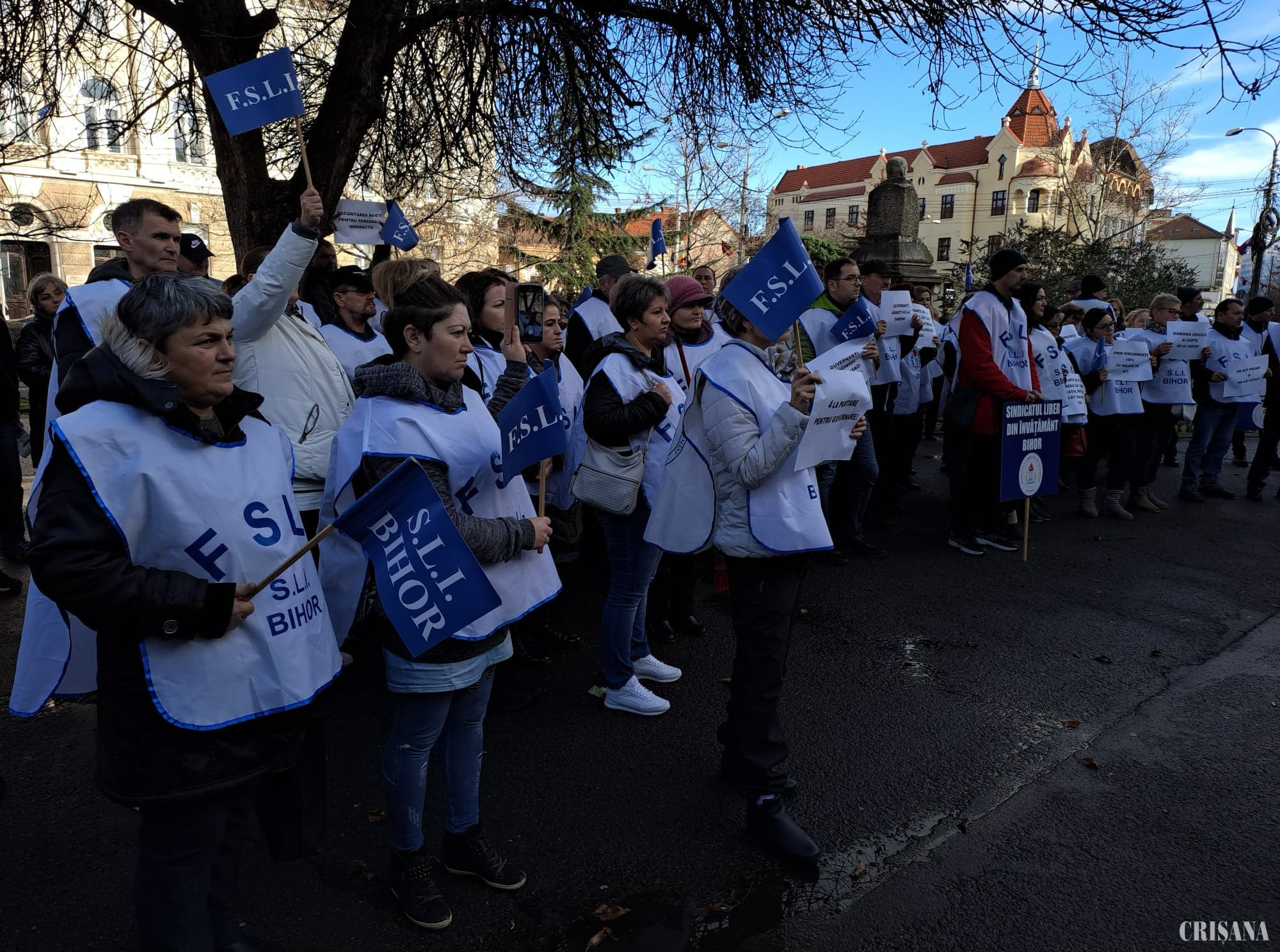 În jur de 150 de angajați din educație au protestat vineri, 16 decembrie, între orele 13.30-14.00, în fața Prefecturii Bihor. Aceştia au dorit să atenţioneze autorităţilor locale şi centrale în legătură cu problemele din învăţământ.