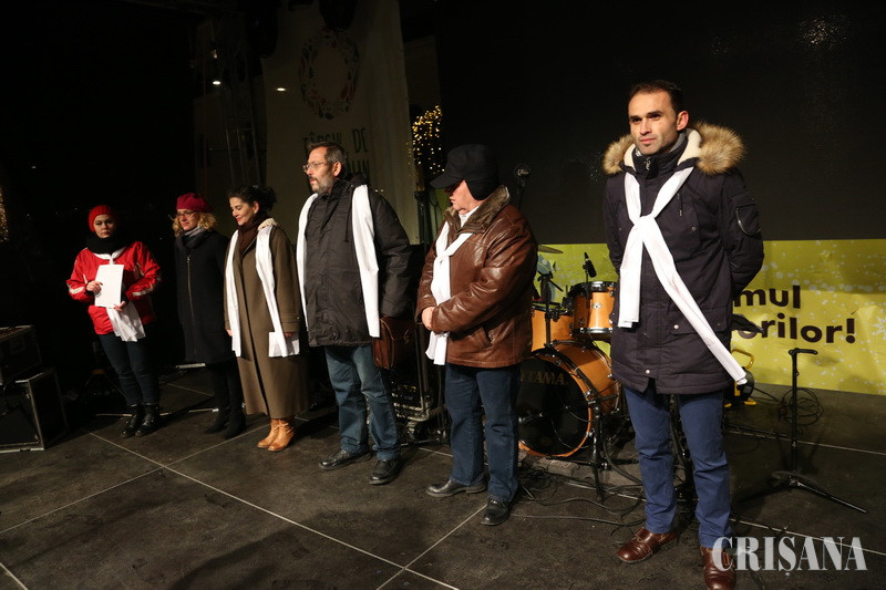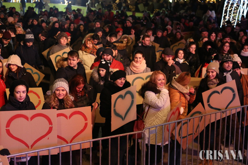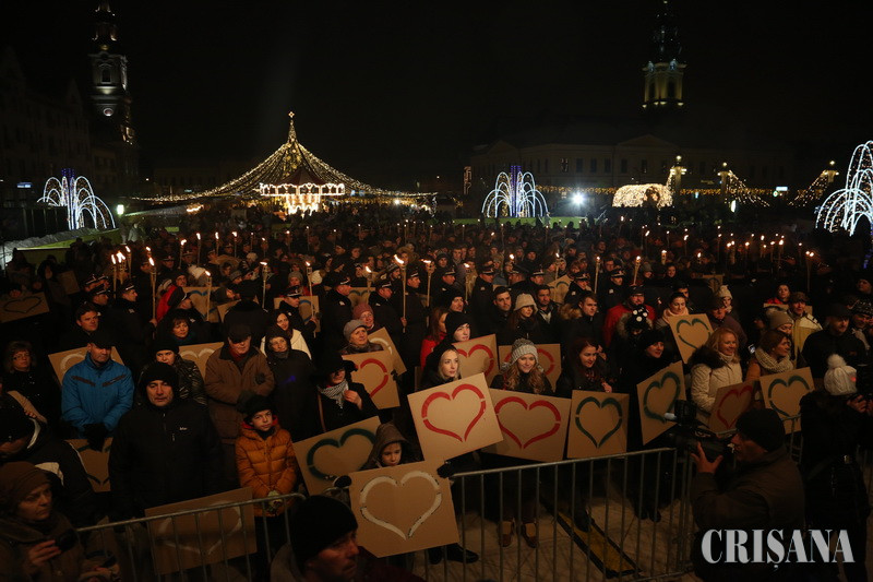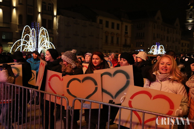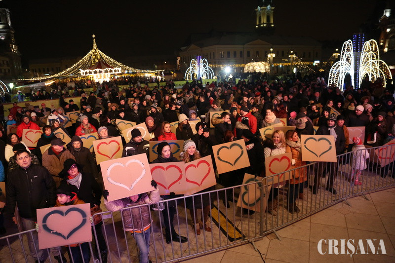 Atmosfera părea una normală cu câteva minute înainte de ora 18.00 în Piața Unirii. Tinerii patinau în spațiul special amenajat, unii își făceau fotografii cu Moșul sau cu bradul de Crăciun din centrul pieței, iar alții își încălzeau degetele de la mâini, încleștate în jurul paharelor cu ceai, capucino sau vin fiert. Din dreapta statuii lui Mihai Viteazul se distribuiau pancarte cu contururi de inimi, iar pe cer pâlpâiau ritmic luminile unei drone. Tinerii care au luat pancartele cu inimi s-au dus în fața scenei acolo unde, în câteva minute, spațiul s-a umplut. Aproximativ jumătate dintre cei care erau așteptați, 4.000, au îndurat frigul pentru a participa la eveniment. Primii care au urcat pe scenă și au vorbit despre eveniment au fost moderatorii, actorii Teatrului Regina Maria, Ioana Dragoş Gajdo şi Andrian Locovei. Ei au fost urmați de mai multe oficialități printre care viceprimarul Florin Birta, reprezentanți ai Prefecturii Bihor, ai DSP Bihor, alături de organizatoarea evenimentului Ligia Burtă - directoarea Centrului de Transfuzie Sanguină Bihor. „Mă bucur că Primăria Municipiului Oradea poate fi partener la un astfel de eveniment, mă bucur că el se întâmplă aici, în Piața Unirii, în atmosfera târgului de Crăciun”, a spus Florin Birta. „Vă iubesc pe toţi! Mă bucur că sunteţi aici şi susţineţi viaţa”, a spus și Ligia Burtă.