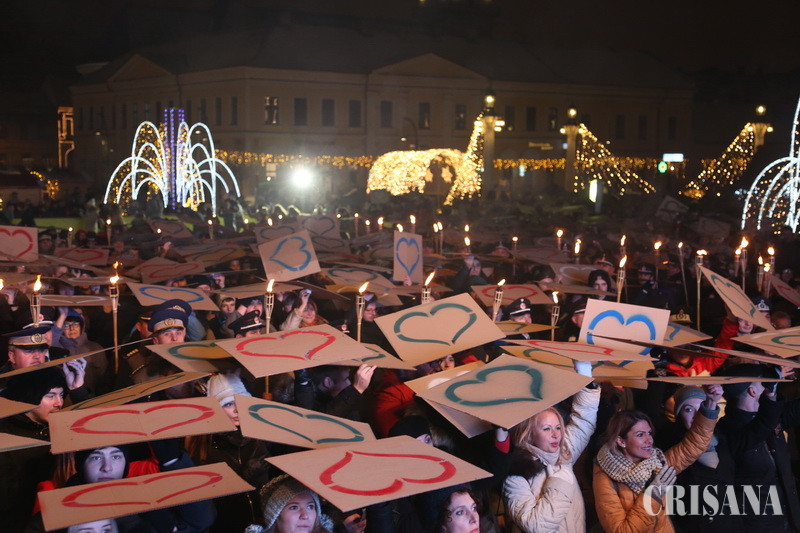 Între timp, în Piață au pătruns reprezentanții ISU Crișana care au format o inimă, cu torțe aprinse. A urmat apoi intonarea imnului compus de Ovidiu Iloc pe versurile Laviniei Georgescu Scripcaru, directorul Centrului de Transfuzie din Iaşi și susținut de un cor pregătit de Carmen Vasile de la Facultatea de Arte a Universității din Oradea. Pe ritmul bătăii unei inimi s-a cântat: „Noi suntem armata ce jertfa de sânge/ Ne-o dăm pentru viaţă, speranţă şi bine”. În timp ce s-a cântat toți cei din fața scenei au ridicat deasupra capului cartoanele cu contururi de inimi. Momentul a fost urmat de un miniconcert susținut de Yohanna Grace, soția premierului Dacian Cioloș.