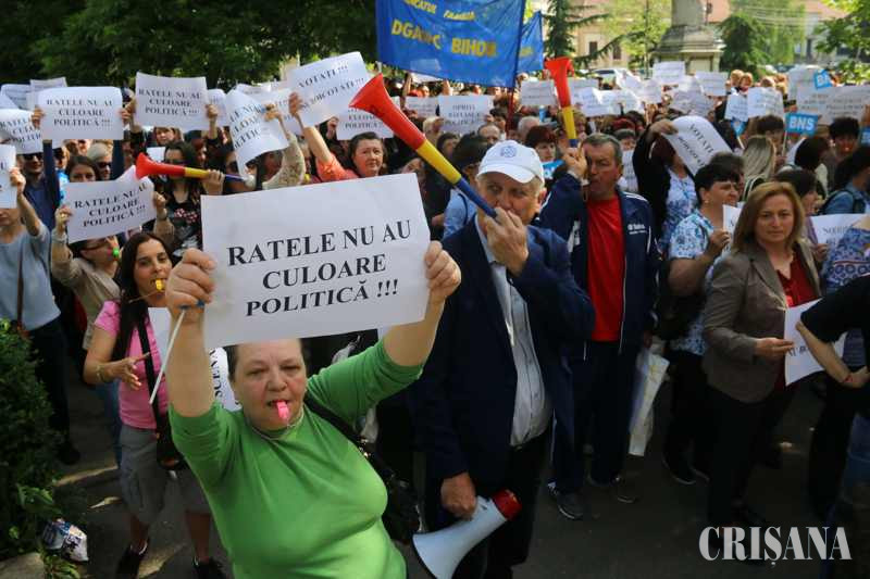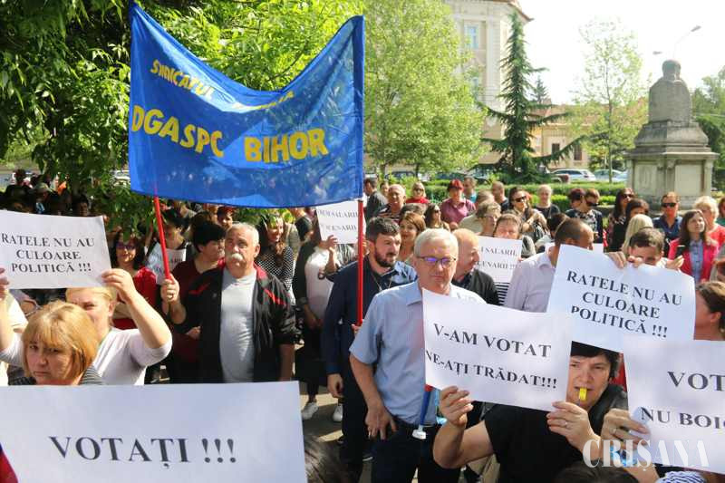 Înarmați cu pancarte, fluiere și vuvuzele, peste 300 de angajați ai Direcției Generale de Asistență Socială și Protecția Copilului Bihor au protestat ieri, în fața Consiliului Județean Bihor, nemulțumiți că nu și-au primit salariile întregi pe luna martie, ci doar în procent de 70%.