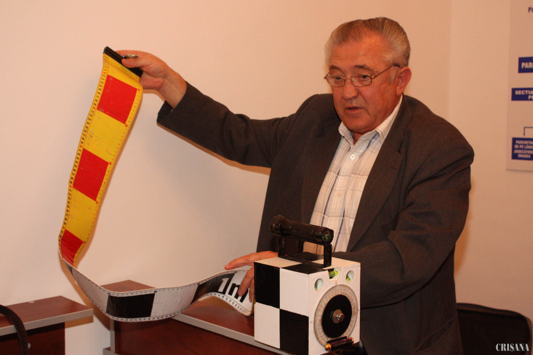 Banda decimetrică, jetonul piramidal şi planşeta foto sunt cele trei obiecte la care a lucrat criminalistul orădean mai bine de un an. Banda, în acest moment, este de fapt o fâşie din material plastic, cu o lungime de zece metri, pe care sunt imprimate dreptunghiuri albe şi negre. "Cea folosită în prezent are multe inconveniente. Materialul este subţire, nu se fixează bine, îşi schimbă poziţia la cea mai mică adiere de vânt şi se poate greşi uşor la numărarea decimetrilor", a precizat Nicolae Meseşan. Astfel, criminalistul a conceput banda inscripţionată în metri, centimetri şi milimetri, cu două feţe, patru culori, care se rulează cu un dispozitiv în propria carcasă. Există, de asemenea, un dispozitiv de fixare, iar cutia în care se rulează banda are un magnet puternic, ce permite fixarea de diferite corpuri metalice. Cutia a mai fost prevăzută cu o lanternă, dar şi cu un termometru digital, un telemetru cu infraroşu sau o nivelă cu bulă pentru stabilirea unghiurilor. "De exemplu, la accidentele rutiere, este nevoie de doi oameni care să întindă banda. Cu ajutorul noului dispozitiv şi al magnetului, cutia se poate aşeza pe autoturismul implicat în incident, de exemplu, iar o singură persoană trage banda", a explicat tehnicianul. Invenţiile lui nu se opresc aici, jetonul piramidal pliabil fiind o altă noutate. Jetonul este folosit la cercetarea la faţa locului, stabilind exact locul din câmpul infracţional unde se găsesc corpurile delicte, urmele, cadavrele etc. "Vechiul jeton este simplu, o bucată de plastic aşezată pe un suport care trebuie rotită atunci când este fotografiată. Noul jeton are formă piramidală şi o busolă fixată în vârf. Noutatea constă în faptul că, din orice direcţie îl fotografiem, numărul este vizibil. În plus, jetonul nou are un trepied telescopic, uşor, care este util atunci când la faţa locului avem terenuri denivelate, şanţuri, vegetaţie înaltă", a mai spus Meseşan.