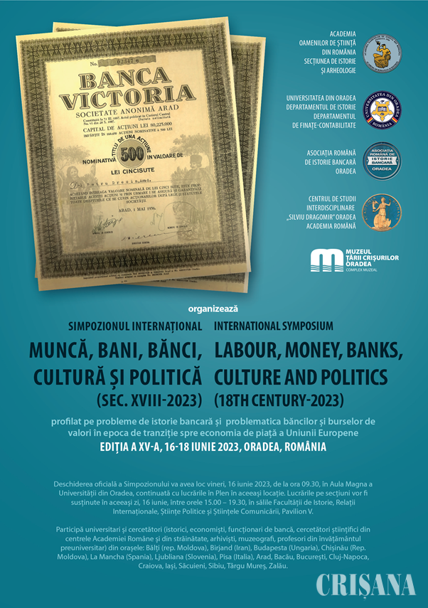 Universitatea din Oradea va găzdui, vineri și sâmbătă, cea de-a XV-a ediție a Simpozionului Internațional de Istorie Financiar-Bancară. Ceremonia de deschidere și lucrările în plen se vor desfășura vineri, 16 iunie, între orele 9.00 – 13.00, în Aula Magna.