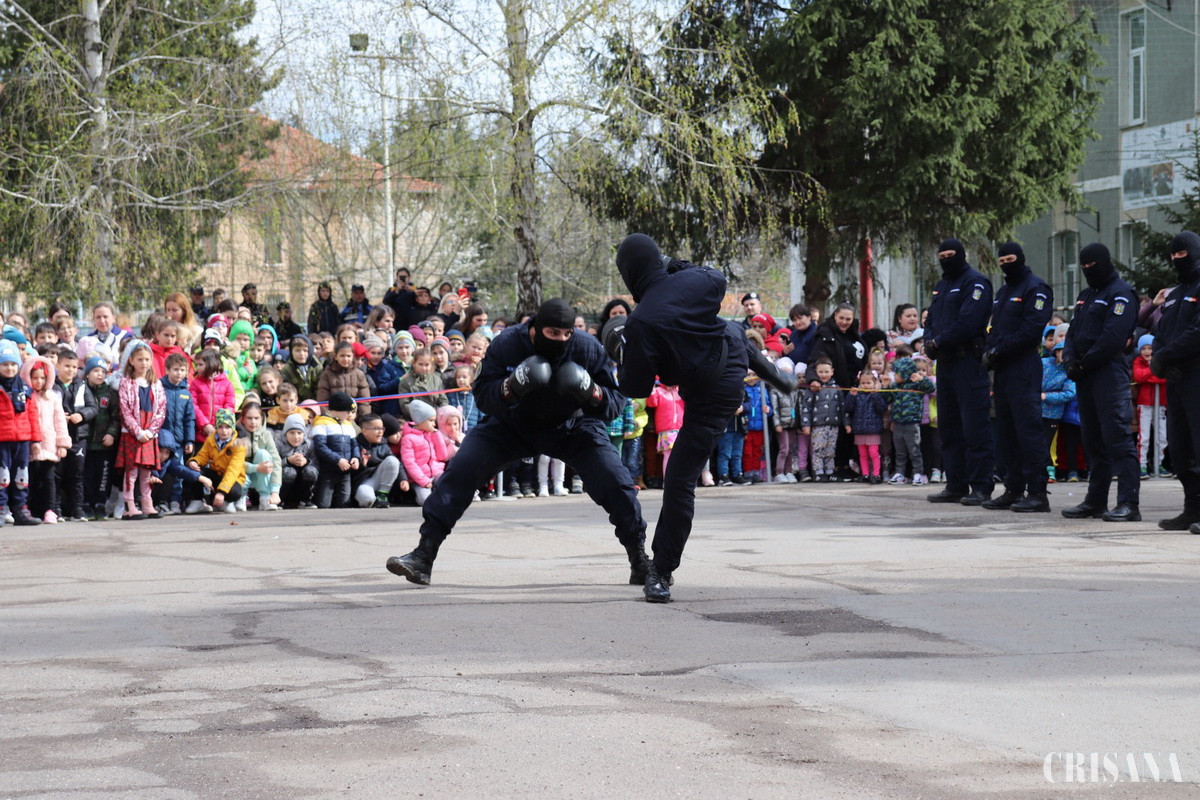 În prezența unui număr de aproximativ o mie de copii, jandarmii bihoreni au desfășurat exerciții demonstrative și de dresaj canin în cadrul cărora au fost exemplificate câteva dintre atribuțiile îndeplinite de Jandarmeria Română. Cei prezenți au avut posibilitatea de a testa materialele din dotarea jandarmilor și sirenele autospecialelor.