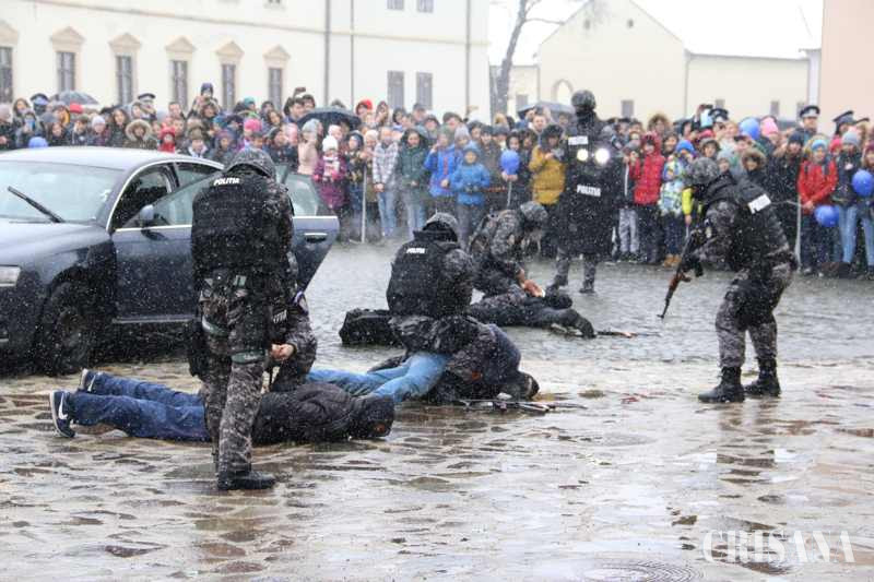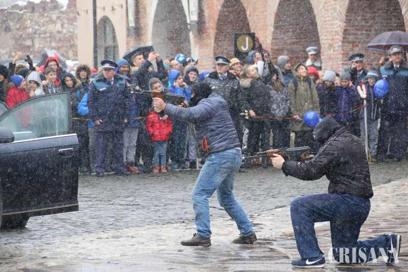 După şedinţa festivă, evenimentele dedicate cetăţenilor au fost desfăşurate anul acesta în Cetatea Oradea, acolo unde au fost prezentate activităţile pe care le desfăşoară zi de zi poliţiştii bihoreni, dar şi dotările de care aceştia dispun în executarea misiunilor, pe ateliere de lucru. IPJ Bihor a organizat şi o expoziţie inedită de fotografie, „100 de ani de poliție în județul Bihor”, în Muzeul Cetății Oradea – Poliția Bihoreană în imagini și documente de la 1918 până în prezent. Orădenii prezenţi în Cetate, în ciuda condiţiilor meteo, au avut ocazia să asiste la prezentarea dotărilor autolaboratorului criminalistic, cu suportul de specialitate al poliţiştilor criminalişti bihoreni dar şi să afle mai multe despre armamentul şi tehnica din dotarea Poliţiei Bihorene. Tot în Cetate au fost amplasate standuri de documentare – informare în cadrul cărora au fost distribuite pliante, broşuri şi alte materiale de promovare a profesiei de poliţist şi cu conţinut educativ – preventiv. Cele mai aşteptate momente au fost şi anul acesta demonstraţiile şi exerciţiile tactice ale luptătorilor Serviciului pentru Acţiuni Speciale şi ale unităţii canine. Chiar dacă vremea nu a fost prielnică, zeci de copii i-au urmărit entuziasmaţi pe “mascaţi”. Primul exerciţiu l-a avut ca protagonist pe Ren, un ciobănesc german în vârstă de cinci ani, care a efectuat o demonstraţie de dresaj iar apoi, alături de conductorul său, a imobilizat o persoană recalcitrantă. Luptătorii şi pirotehniştii au prezentat un exerciţiu de interceptare în trafic a unui grup de infractori şi au neutralizat un colet care conţinea un dispozitiv exploziv improvizat. Cel mai spectaculos exerciţiu a fost însă cel care, potrivit scenariului, un grup infracţional format din trei persoane a fost prins în flagrant în timp ce comitea un jaf armat la o bancă, tâlharii fiind rapid imobilizaţi şi reţinuţi de luptătorii SAS.