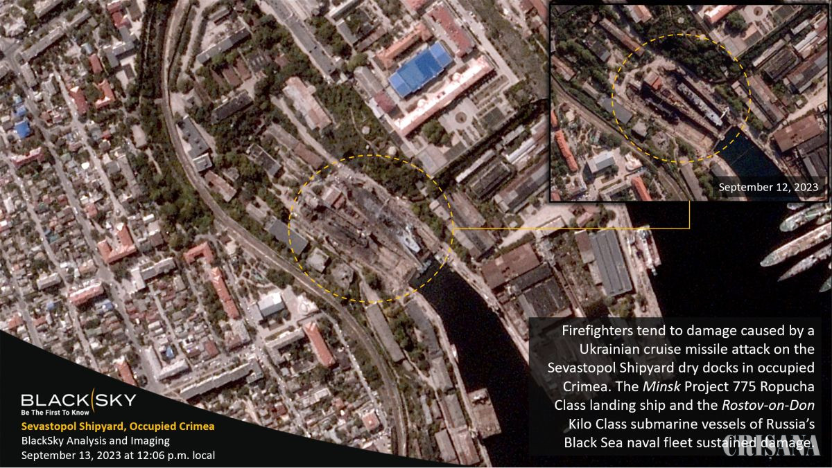 Între timp, imagini captate din satelit de compania privată Black Sky confirmă că atacul ucrainean cu rachete efectuat în noaptea de marţi spre miercuri asupra şantierului naval de la Sevastopol, în Crimeea ocupată de Rusia, a avariat o navă de asalt amfibiu şi un submarin din Flota Rusă a Mării Negre care se aflau în reparaţii la şantierul naval.