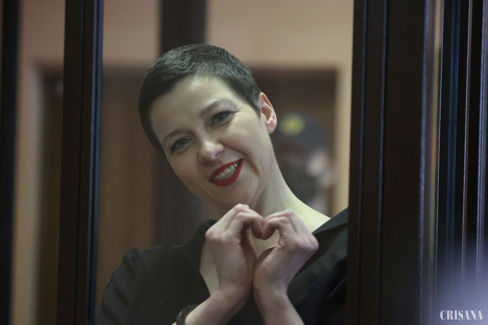 Conform unor imagini difuzate luni de conturi de pe serviciul de mesagerie Telegram, Maria Kolesnikova, în vârstă de 39 de ani, surâzătoare, a făcut semnul inimii cu mâinile încătuşate în cuşca de sticlă rezervată acuzaţilor. Semnul a fost unul din gesturile de mobilizare din timpul mişcării de contestare din 2020.