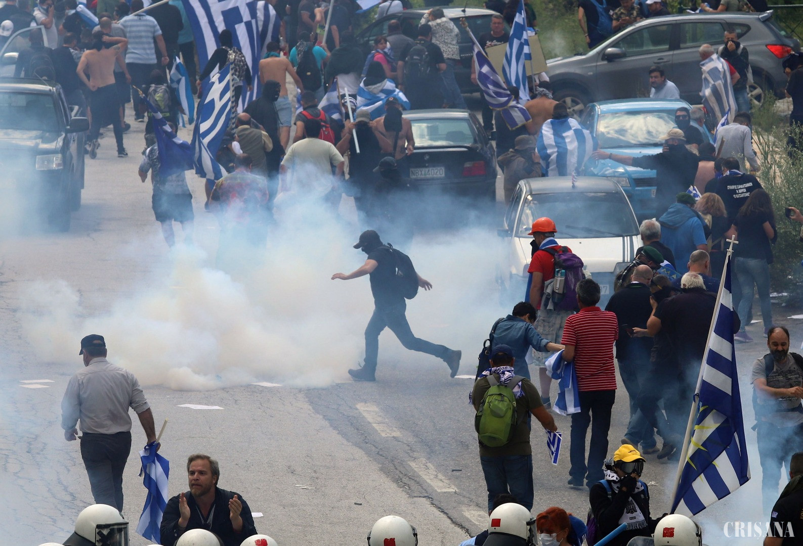 Manifestanții, care aveau steaguri ale Greciei, au încercat să se apropie de locul unde a avut ceremonia de semnare a acordului. Aceștia au fost, însă, înconjurați de autorități în localitatea Pisoderi, la doar câțiva kilometri de locul ceremoniei. Un detașament de jandarmi a blocat drumul rural, în timp ce alții au folosit gaze lacrimogen pentru a opri manifestanții.