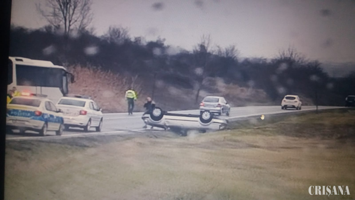 Un autoturism s-a răsturnat azi, în jurul orei 14.30, pe DN 19, la ieșirea din Oradea spre Biharea. Deși, mașina a ieșit în decor, răsturnându-se cu roțile în sus, nimeni nu a fost rănit, accidentul fiind încadrat la tamponare. O perioadă scurtă s-a circulat alternativ. Cel mai probabil, cauza accidentului a fosta neadaptarea vitezei la condițiile de trafic.