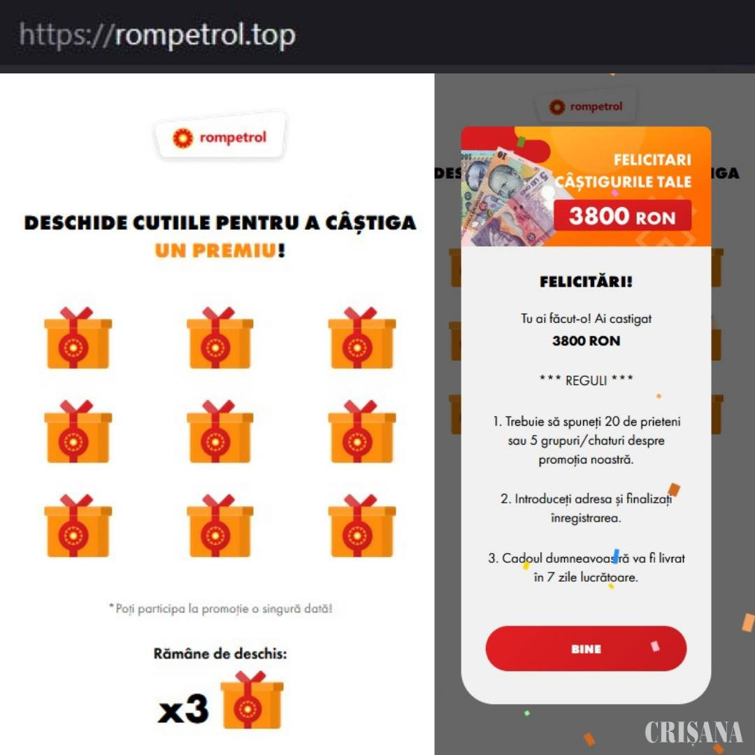 Avertismentul a fost lansat ieri de experţii Directoratului Naţional de Securitate Cibernetică (DNSC). „Ne apropiem cu rapiditate de perioada reducerilor specifice #BlackFriday, iar infractorii din online au lansat deja propriile 'campanii promoţionale', folosindu-se de imaginea unor branduri cu renume în România. Sub pretextul posibilităţii de a câştiga un premiu sau un voucher de cumpărături, utilizatori din România primesc (pe social media sau aplicaţii de mesagerie) mesaje cu linkuri către site-uri compromise unde se prezintă oferte promoţionale false. Echipa Directoratului a primit notificări cu privire la existenţa unor astfel de tentative de la utilizatori care au realizat că este vorba despre o păcăleală şi a luat imediat măsurile necesare închiderii lor. Cu toate acestea, atacatorii pun în funcţiune noi site-uri care găzduiesc astfel de iniţiative frauduloase aproape zilnic. Momentan metoda foloseşte imaginea de brand a unor companii precum Rompetrol, Profi Romania sau Compania Naţională Poşta Română, însă nu este exclus ca atacatorii să extindă numărul de organizaţii a căror identitate vizuală este folosită în atacuri", semnalează specialiştii DNSC pe pagina de Facebook a instituţiei.