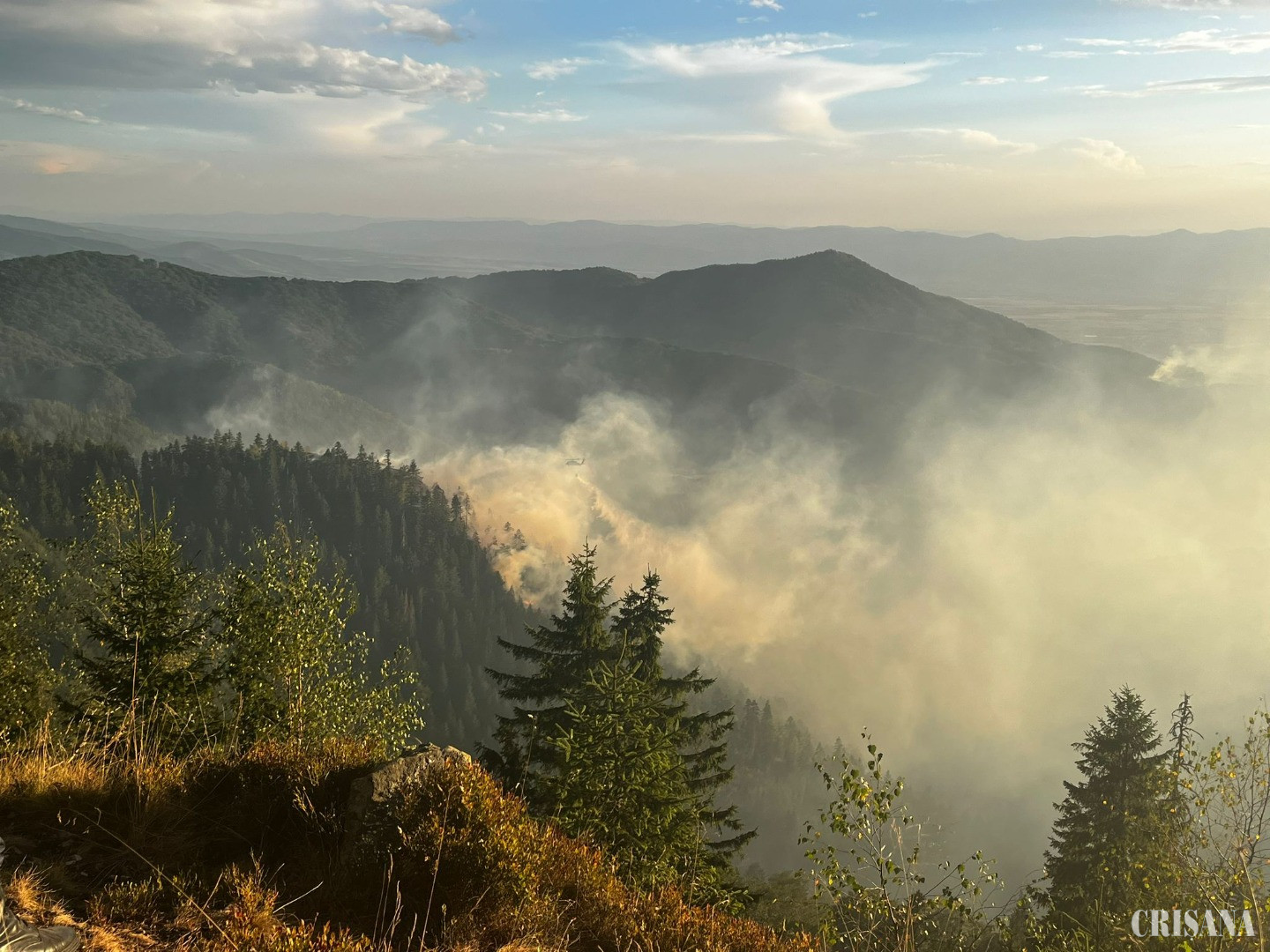 Incendiu forestier masiv între Budureasa și Stâna de Vale - Intervenție dificilă din cauza terenului accidentat, a fost solicitat și un elicopter